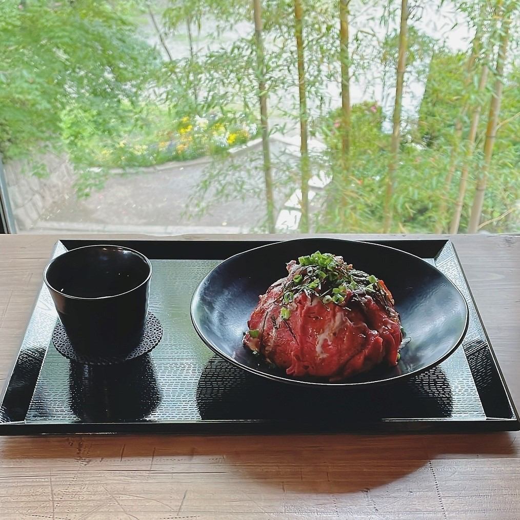 瘦肉的鮮嫩口感,以及濃鬱的香味,讓人欲罷不能。還附贈湯!此外,還有美味的辣烤牛肉蓋飯和賞月烤牛肉蓋飯。